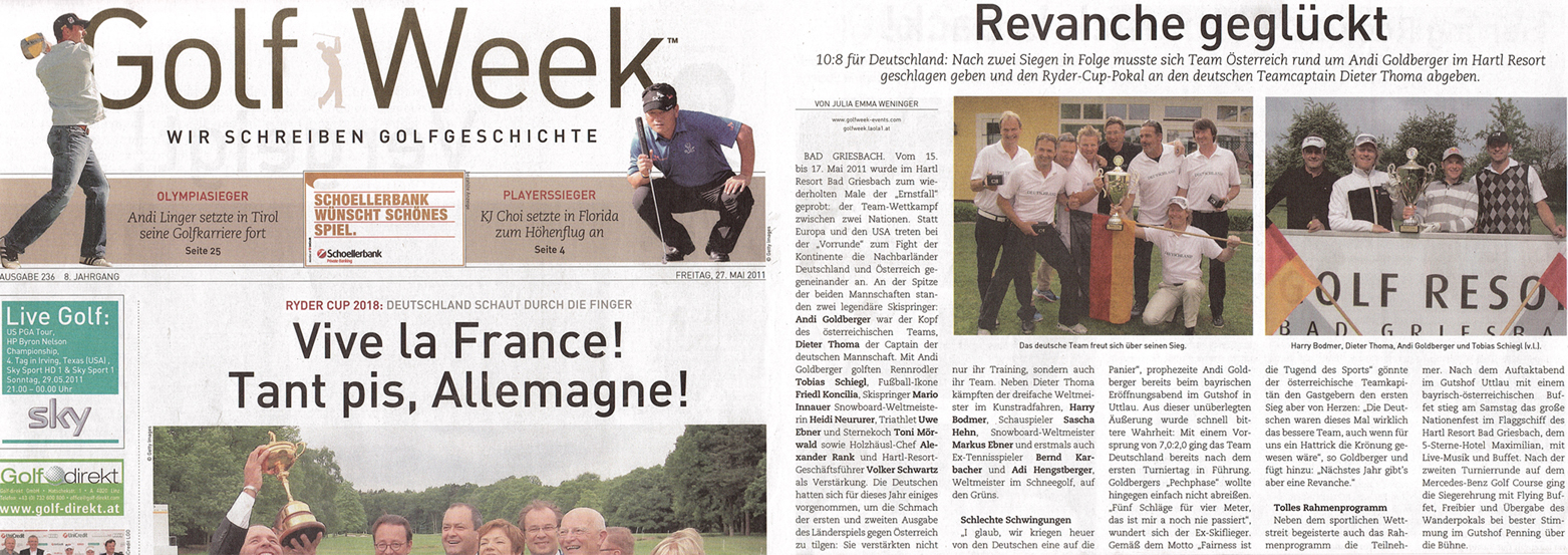 03.02.2009 | Obertauern, SchlagzeilenViele Sieger bei erster Snowgolf-Weltmeisterschaft in ObertauernBeim weltweit prestigeträchtigsten Schnee-Golfturnier in Obertauern am letztenWochenende erkämpfte Adi Hengstberger (Deutschland) zum zweiten Mal nach2007 den Weltmeistertitel. Weltbeste der Damen wurde Sarah Hölzl (Österreich).Neben dem WM-Titel ging es für die Teilnehmer in der Putting Arena auch um eineMillion Dollar. Prominente Teilnehmer wie DJ Ötzi, Box-Ass Axel Schulz oder AirRace Weltmeister Hannes Arch putteten füreinen guten Zweck.Der beliebte Trendsport Golf in ungewöhnlicher Umgebung lockte Prominente undSpieler aus der ganzen Welt in das hochgelegene Skiresort Obertauern.Ausgetragen wurde die Snowgolf-Weltmeisterschaft auf einem 9 LochChampionship Course (Par 36, 2.700m Länge). Die präparierten Whites (Greens)und Fairways waren ein Wintertraum an Spielbedingungen. Beste Spieler nach AdiHengstberger waren Tristan David (Philippinen) und Peter Dobrowolsky(Österreich). Andrea Fendrich erzielte den zweiten Platz bei den Damen und BirgitHuber den dritten.Beim Schlag um eine Million Dollar versuchten sich viele Persönlichkeiten ausSport und Showbiz, die für „Wings for Life” (Stiftung für Rückenmarksforschung)und für den „Eagles Charity Golf Club” antraten, um den „Million Dollar Putt” zulochen. Die Red Bull Salzburg Kicker Alex Zickler und Rene Aufhauser, Fussball-Weltmeister Rainer Bonhof, ÖGV-Präsident Franz Wittmann und Sascha Wussowsorgten in der Arena für großartige Stimmung. Zweimal schaute der Ball ins Loch –der Jackpot wurde schließlich knapp nicht geknackt. (MuP